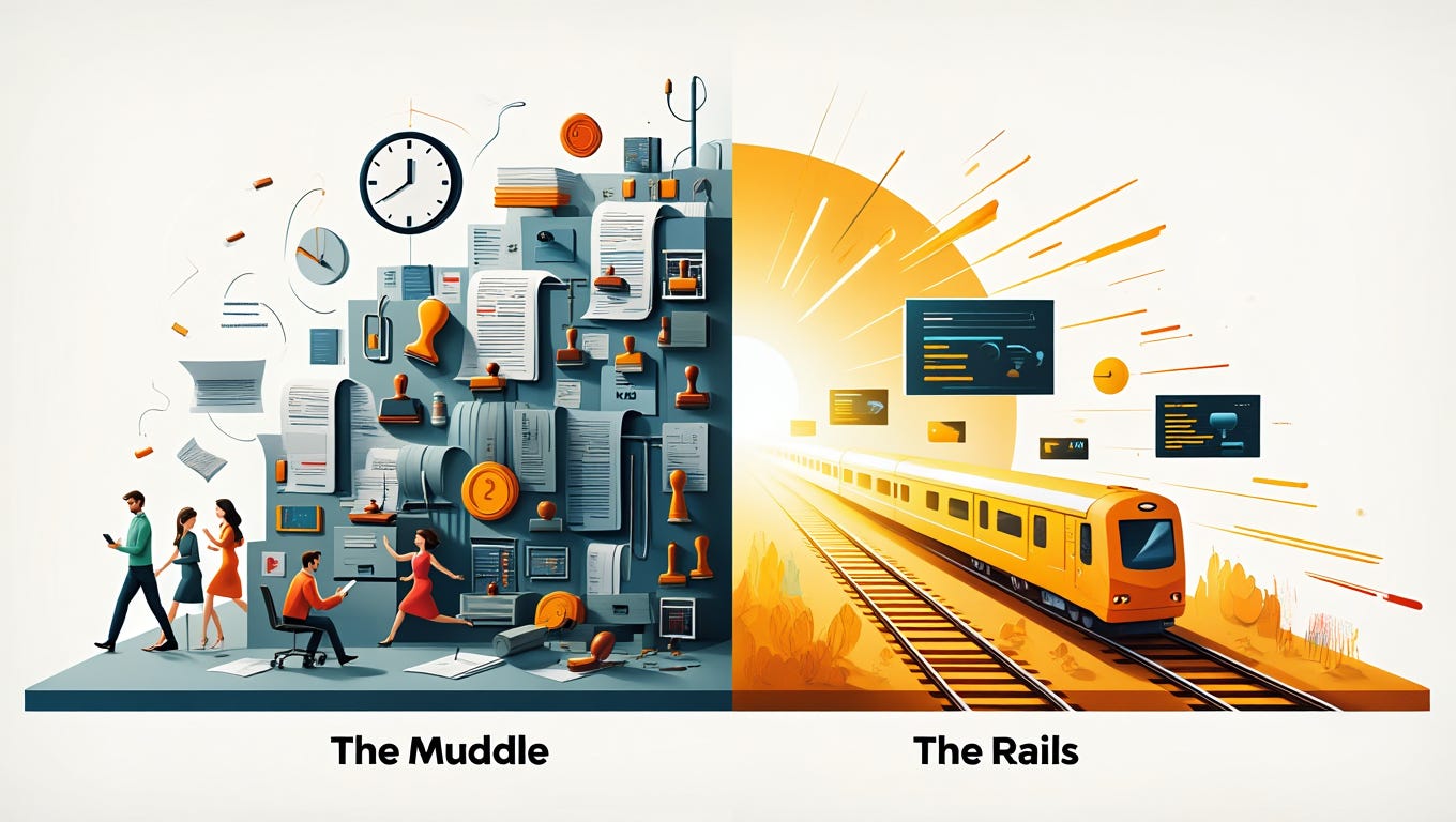The essay distinguishes the “Muddle,” entrenched bureaucracy still paying for effort rather than outcomes, from the “Rails,” outcome-based contracts, targeting authorities, and compute escrows that actually drive progress. The former will absorb AI without changing; the latter will compound it into abundance.