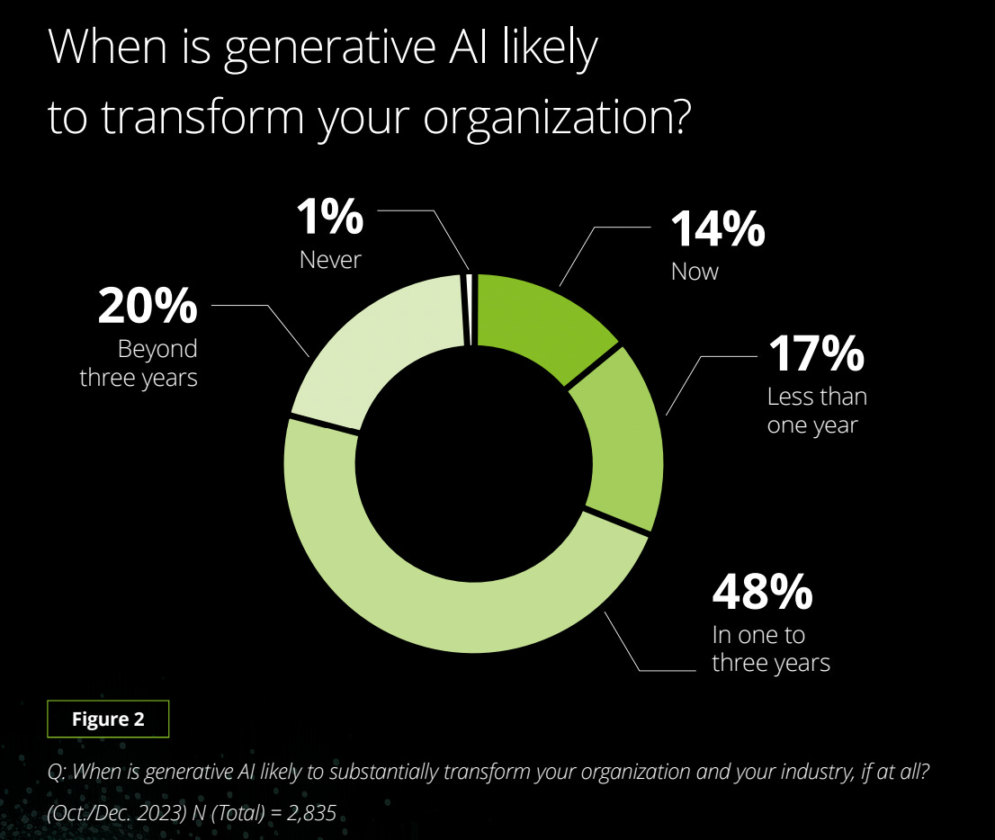 A remarkable 48% of businesses surveyed say generatuve ai is going to have a transformative impact on their business in the next two years