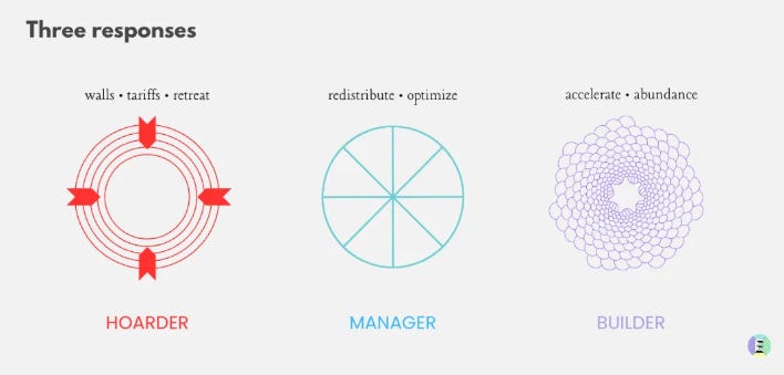 This kind of segmentation - hoarders, managers and builders - provides a fairly coherent worldview explaining some of our current disconnection. And more importantly, points to a concrete path forward - building, positively loudly and in public.