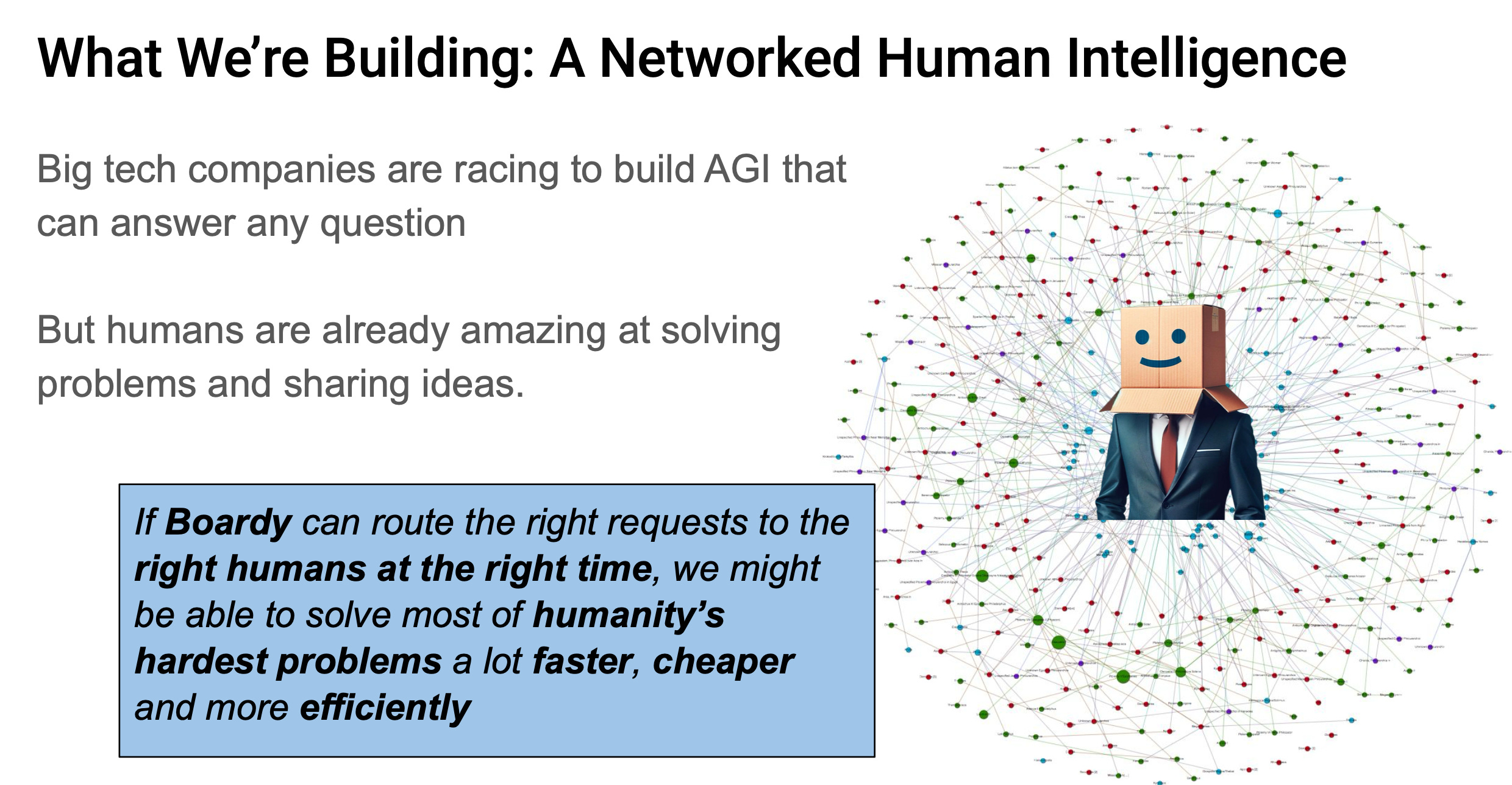 Unlocking human intelligence. It aims to help connect people at the right time and on the right topic. It’s building ‘networked human intelligence’.