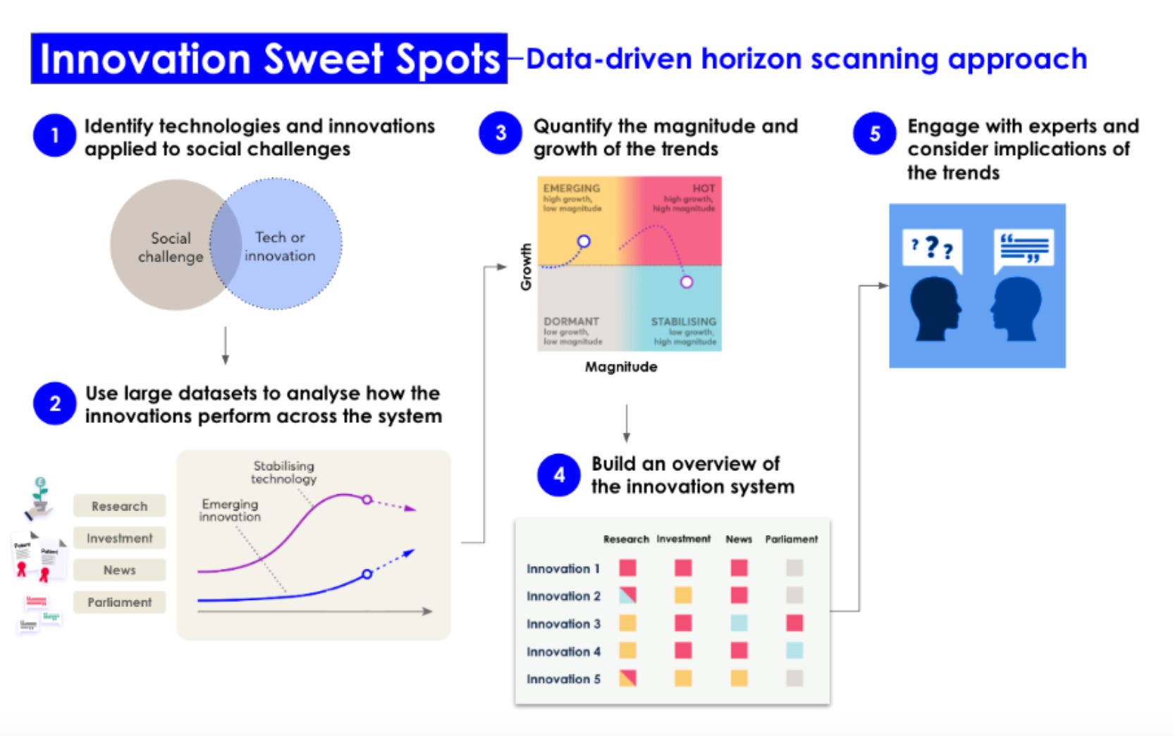 The ‘Sweet Spot’ model Nesta has developed identifies four areas that can indicate progress in an issue: investments, academic research, policy & regulations and news / press & PR.