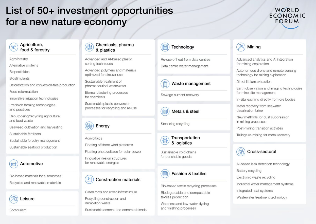 The World Economic Forum has published a new report identifying 50 investible opportunities in the nature-positive economy — a market the report values at $10 trillion annually by 2030. The green economy (largely energy transition) already represents $8 trillion in listed equity and has outperformed global equities by 59% since 2008.