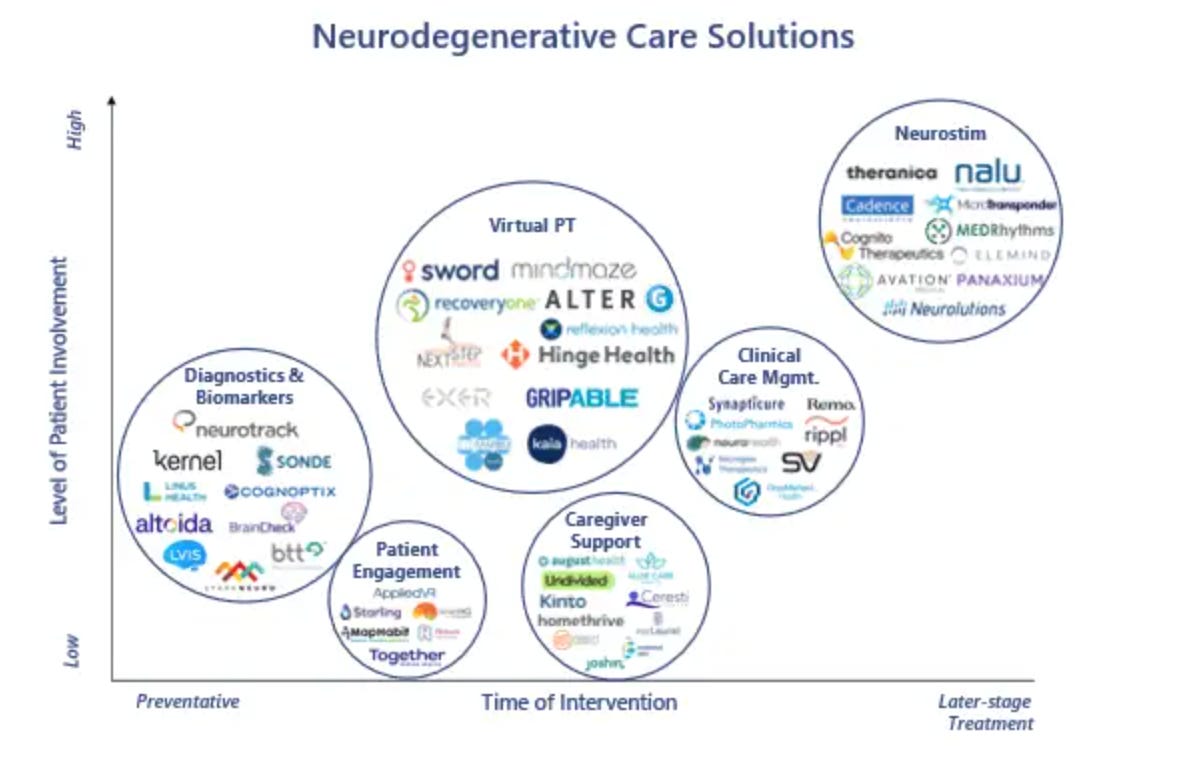 A survey of digital health’s applicability to neurodegenerative diseases by 7wireVentures, with the following six categories of applications, based on disease stage and level of patient involvement: