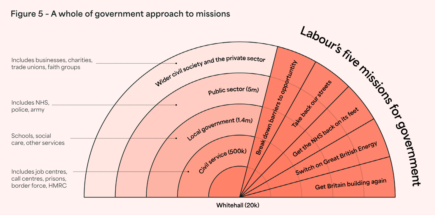 The document also includes this schema listing potential missions for a new UK government and view into the multiple different layers of the bureaucracy that will need to be activated to deliver them.